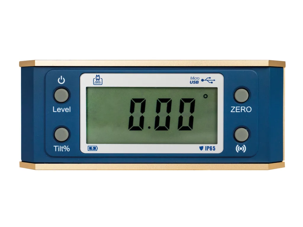Moore & Wright Magnetic Digital Level with magnets on bottom measuring surface. Powered by a built in battery with Micro USB charging. IP65 rated.