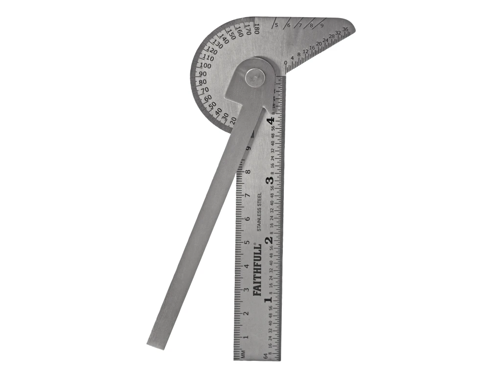 The Faithfull handy pocket-sized Multi-Purpose Angle Protractor is manufactured from stainless steel. It can be used as a 100mm measuring rule, also functioning as a protractor, a square, a centre finder, a circle divider and a drill point gauge.