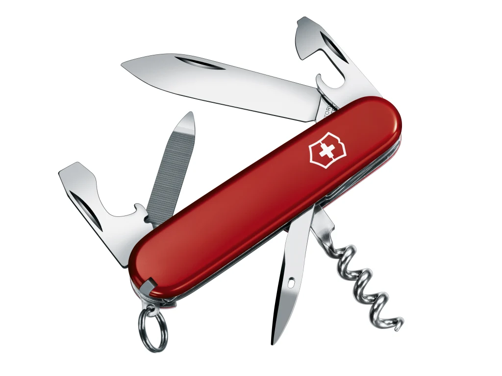 The Sportsman Swiss Army Knife has a large blade, a nail file with nail cleaner, a corkscrew, a can opener with a small screwdriver, a bottle opener with a screwdriver and wire stripper, a reamer/punch tool, tweezers, toothpick and a keyring.